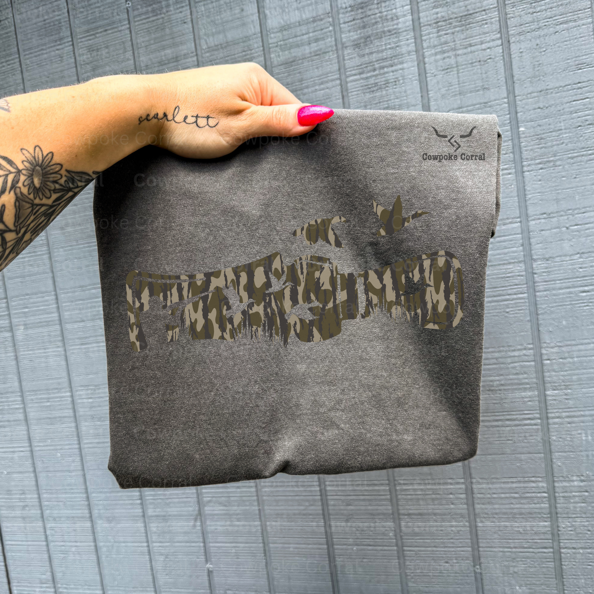 Show off your love for the hunt with this Duck Caller Camo Tee. Its playful camo pattern blends comfort and style, perfect for outdoor adventures or casual days. Whether you’re calling ducks or just calling it a day, this tee brings some wild fun to your wardrobe.
