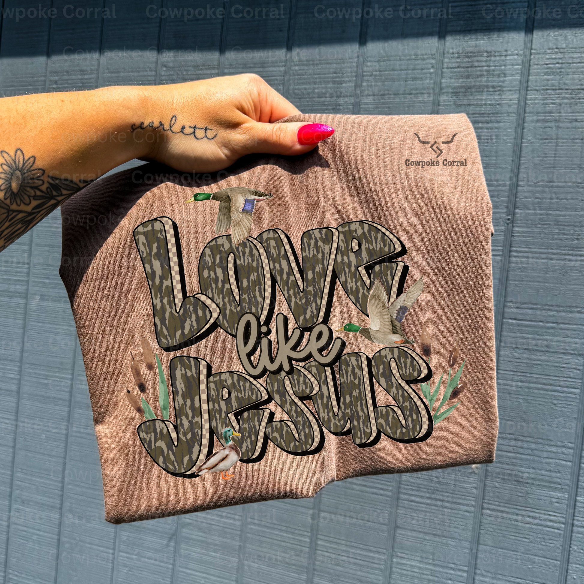 Show your faith and fun spirit with the LOVE LIKE JESUS CAMO TEE. This playful camo shirt reminds everyone to embrace love and kindness, just like Jesus did. Its comfortable fit and bold design make it perfect for everyday wear or casual outings. Spread good vibes and faith with every wear!